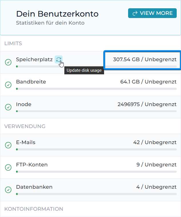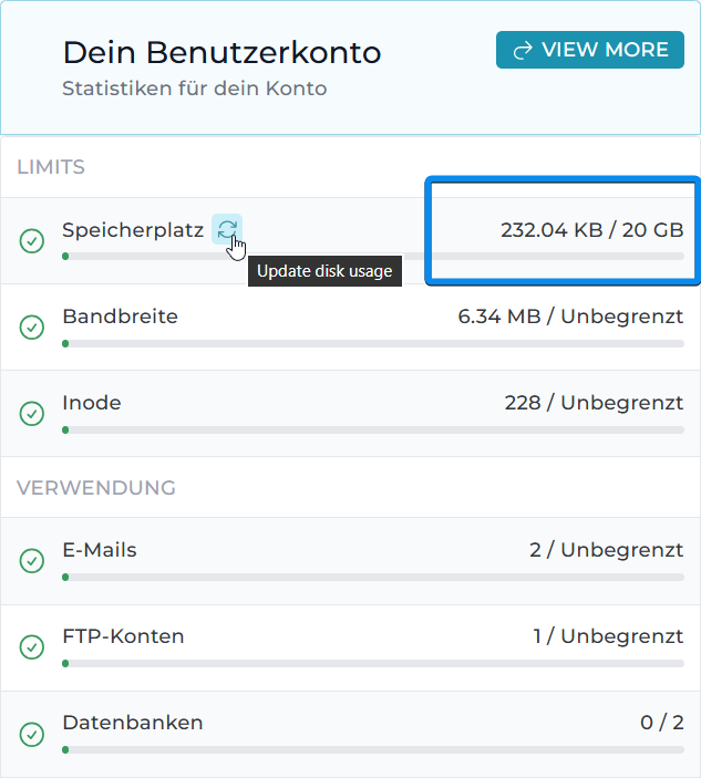 Auf der rechten Seite Ihres Dashboards finden Sie ein Widget, das Ihnen die wichtigsten Limits Ihres Hosting-Pakets anzeigt – darunter auch den „Speicherplatz“.