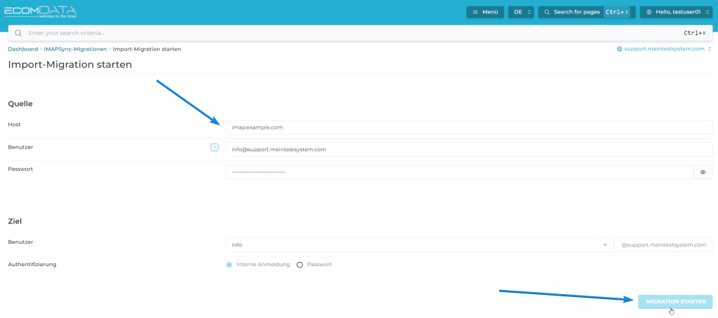 • Passwort: das Passwort des alten Postfachs (IMAP-Passwort)