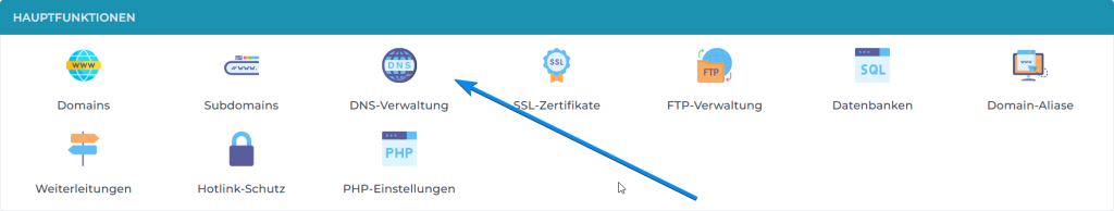Hierfür öffnen wir das DirectAdmin Hosting-Panel und klicken in der ersten Reihe auf „DNS-Verwaltung“.