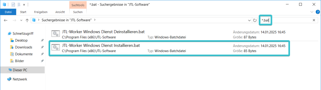 Nach der Durchsuchung befinden sich nur noch zwei Dateien in der Liste. Für die Installation führen Sie die Datei „JTL-Worker Windows Dienst Installieren.bat“ als Administrator aus (Rechtsklick und „Als Administrator ausführen“).
