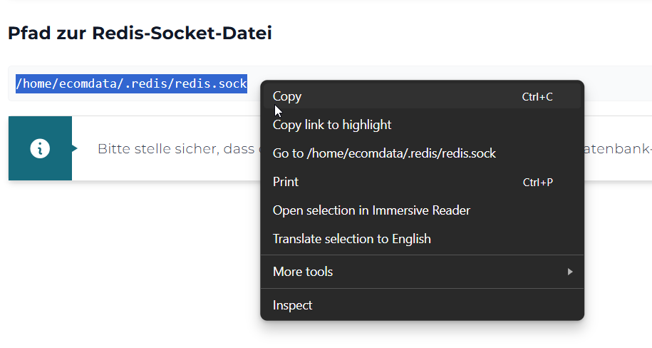 • Kopieren Sie den Pfad zur Redis-Socket-Datei.