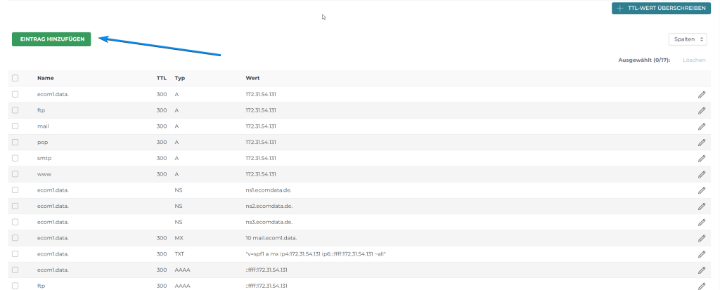 ➕ Klicken Sie nun auf „Eintrag hinzufügen“, um einen neuen DNS-Record anzulegen.