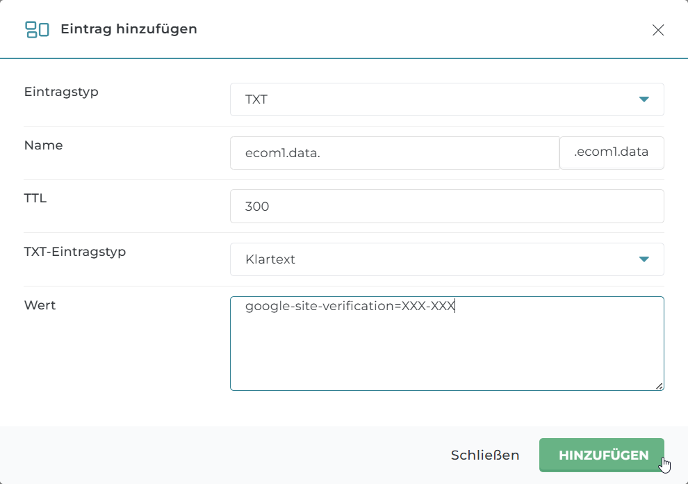 Wählen Sie als Eintragstyp den Typ TXT aus.