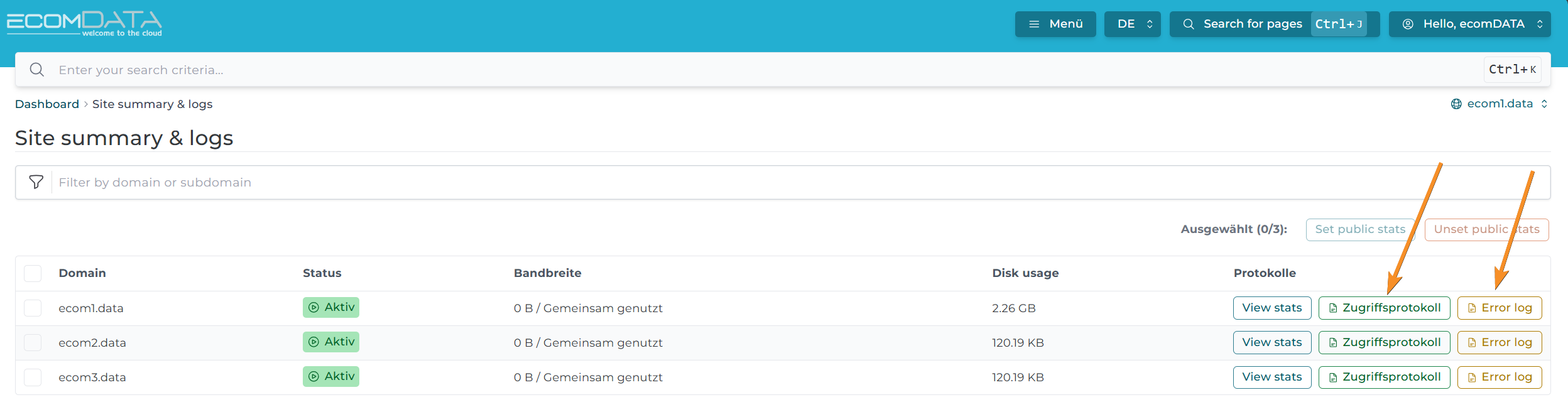 Sie möchten Ihre Zugriffsprotokolle analysieren, Plugins überprüfen, PHP-Fehler untersuchen oder Templates evaluieren? Sie können sowohl die PHP-Fehlerlogs als auch die Webserver-Zugrifflogs im DirectAdmin Panel herunterladen. Für eine detaillierte Anleitung zur Analyse der Zugriffsprotokolle mit GoAccess schauen Sie sich bitte unsere schrittweise Anleitung hier
