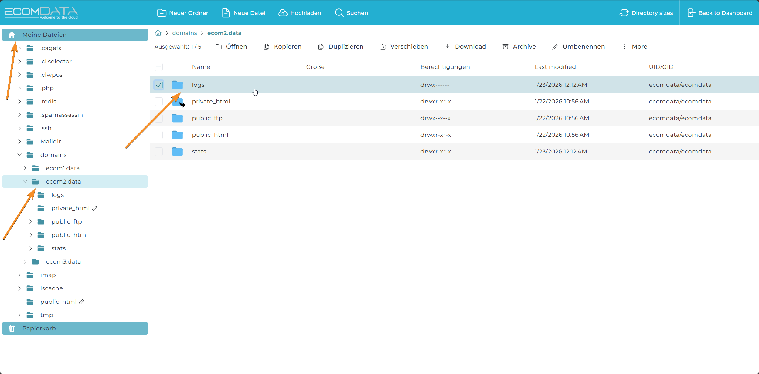 Sie können entweder per SSH, FTP oder mit dem eingebauten Filemanager zu diesem Pfad navigieren und sich die archivierten Logs ansehen.